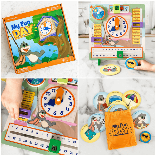 - My Fun Day is a colorful, wooden activity board that teaches the months of the year, days of the week, the four seasons, and telling time