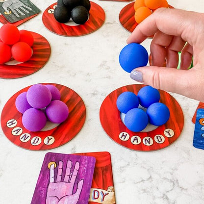 Handy is a totally unique kind of game that’s a whole lot of fun. You’ve definitely never played anything like this before. It’s easy to learn the basics, but very challenging to master and completely unpredictable! Its a great way to get folks laughing and playing together quickly!