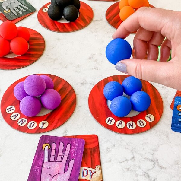 Here’s how to play. You are partners with players seated on either side of you, and share a pile of balls with each of them. All players have one hand in the middle of the table in the “hand tree” while their other hand remains free to turn over cards and add new balls.