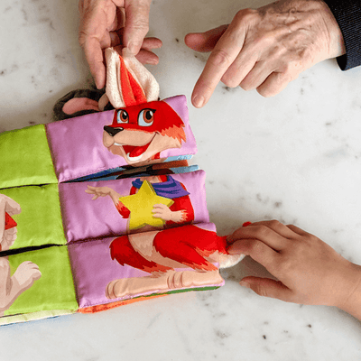 My Fun Buddy Book offers opportunities for sensory exploration. Feel the fluffy, soft pages and the fuzzy ears and tails. Encourage the child to find something fuzzy.