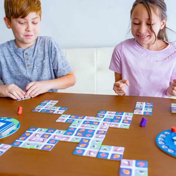 Determining where to place an animal card builds a child's analytical, logic and spatial reasoning skills. When first learning to play, allow all players to flip their cards according to the direction card while exploring placement options. After a few rounds, play according to the rules.