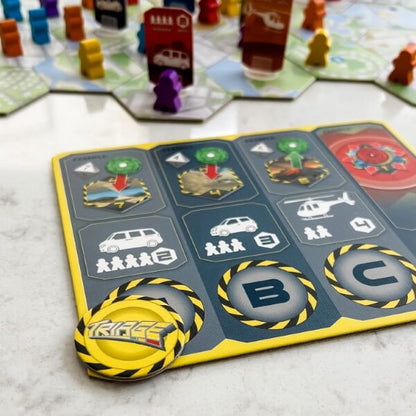 Players need to survey the board to make predication about where vehicles need to go to save the most People Pawns, taking into consideration whether they think they can reach those Pawns before the Impact Level rises too high.