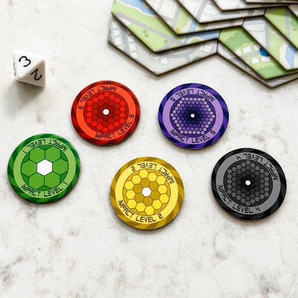 The first impact level affects just the ring of spaces that touch the city. If a city's impact level ever increases to 2, turn the disc over to keep track. If it increases again, switch to one of the level 3 discs, which is also reversible.